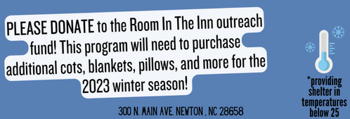 The Fellowship Hall, accessed on N. Ashe Ave, will open at 6 PM on nights Room In the Inn is operational. Coffee and snacks will be available when doors open. Dinner will be served at 7 PM. Lights out at 11 PM.
